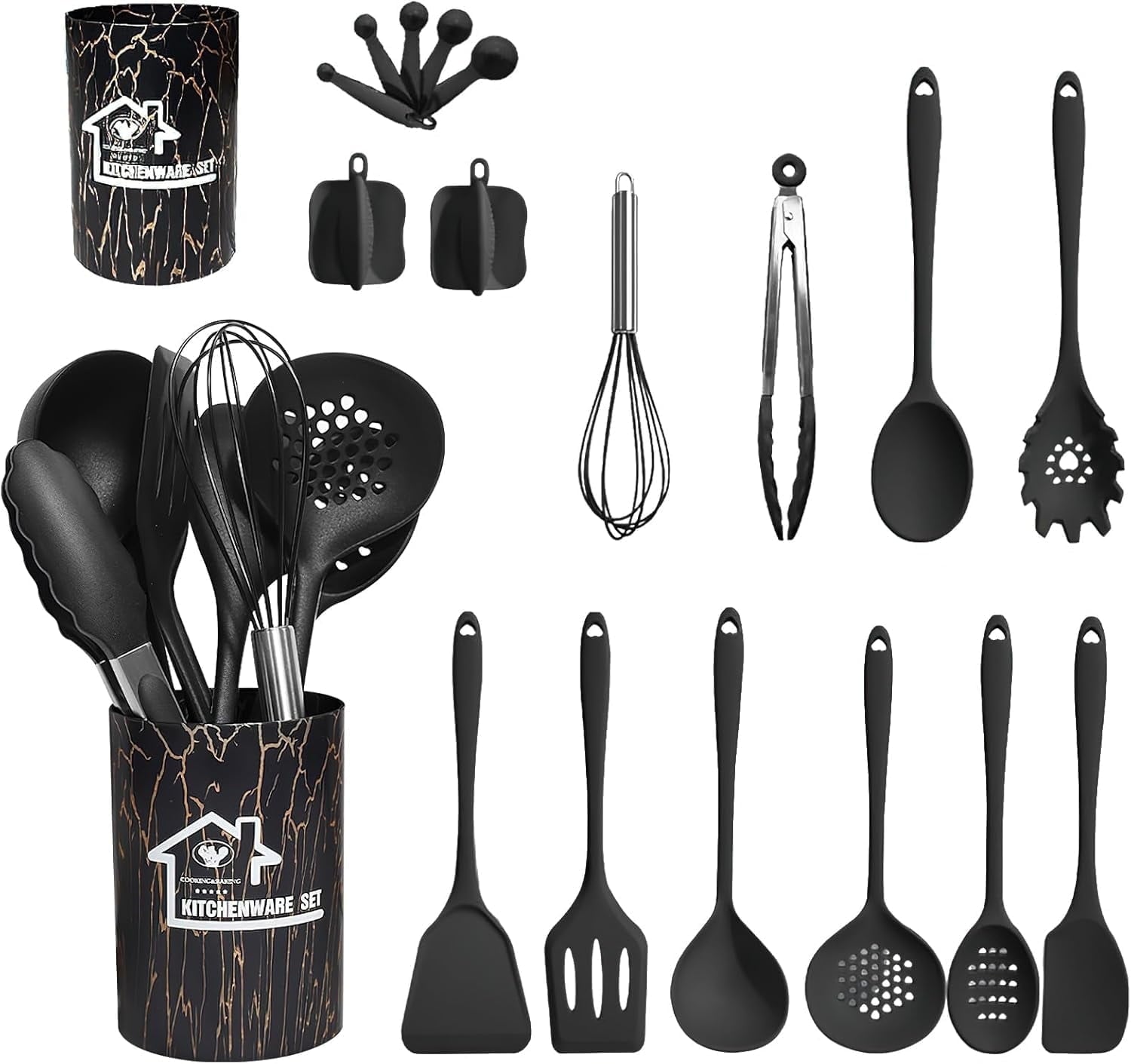 Spaghetti Server, Ladle, Solid Spoon, Slotted Spoon, Leaky Shovel, Turne, Oil Brush, Skimmer, Food Clip, Whisk, 5pcs Piece Measuring Set, 2pcs Hand Clamp, Storage Bucket. This kitchen set includes all the kitchen supplies you may need to meet your inner chef's needs.