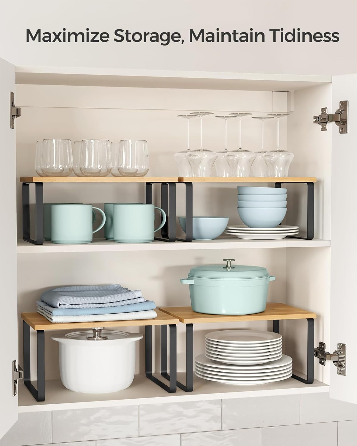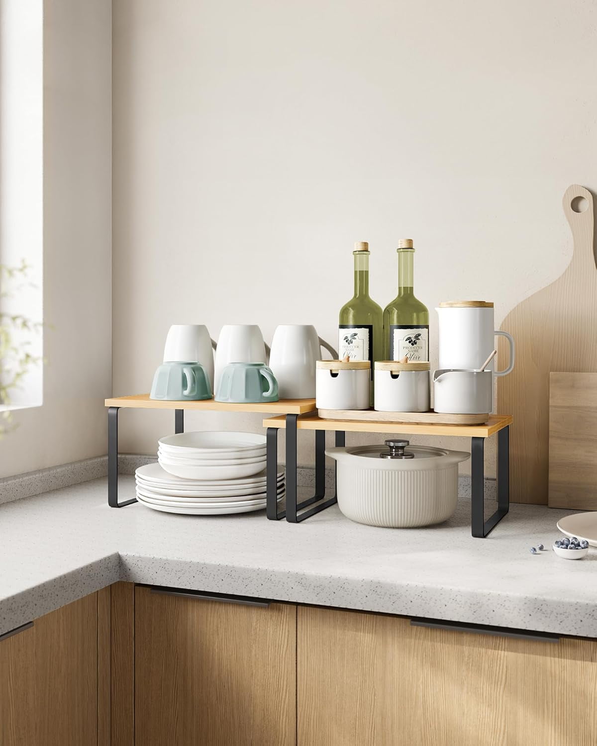 Cabinet Shelf Organizer, Extendable Countertop Shelves Set of 2, Kitchen Spice Racks, Stackable, Storage Racks for Cupboard, Sink, Pantry, Bathroom, Natural, Metal
