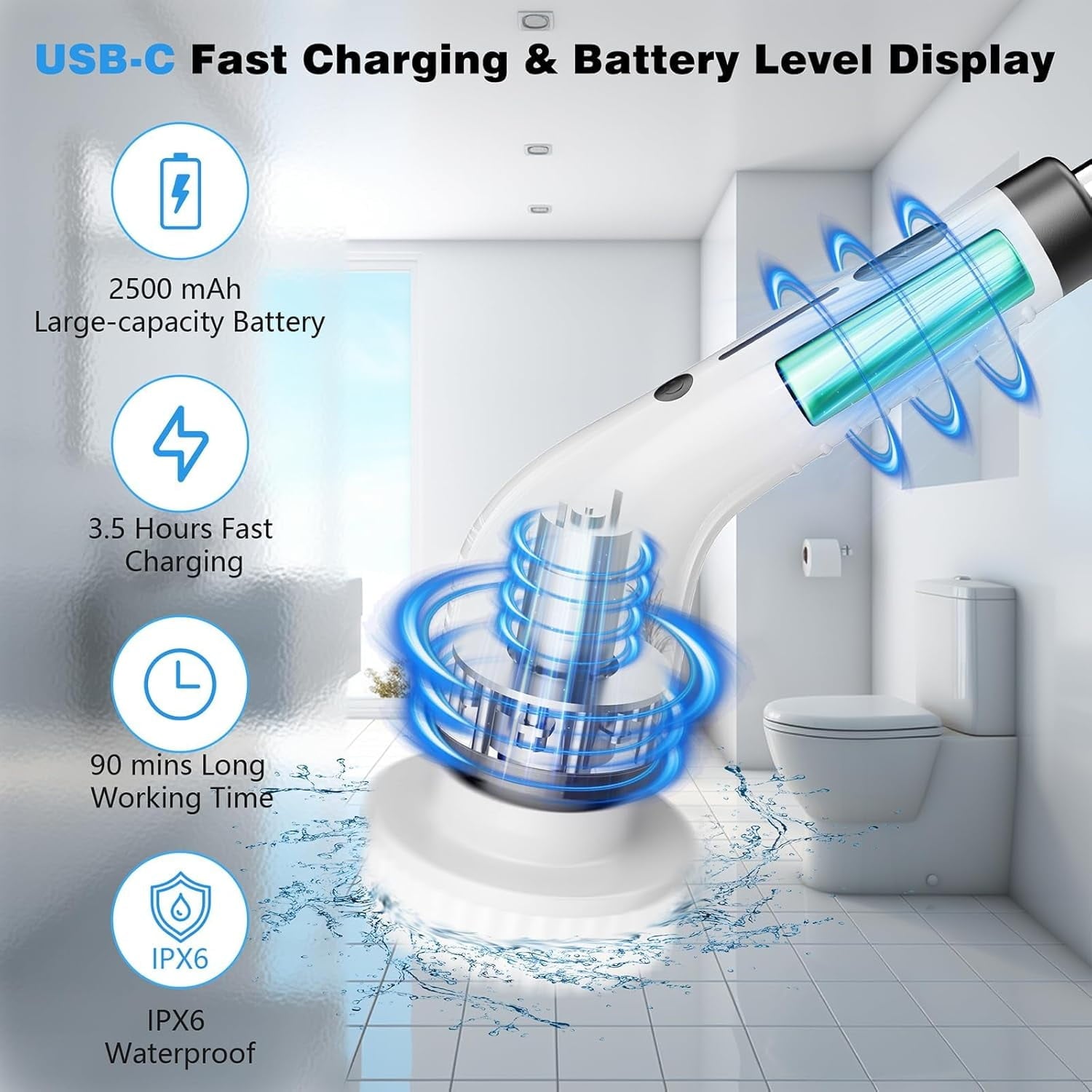 Long handle adopts 3- section design,Retractable Tube adjust from 9.8 to 52 inches,2 speed adjustable(420/380RPM).cordless design and battery(2000mAh),this electric scrubber can work continuously for up to 90 minutes after 3 hours of fast charging(Type-C).