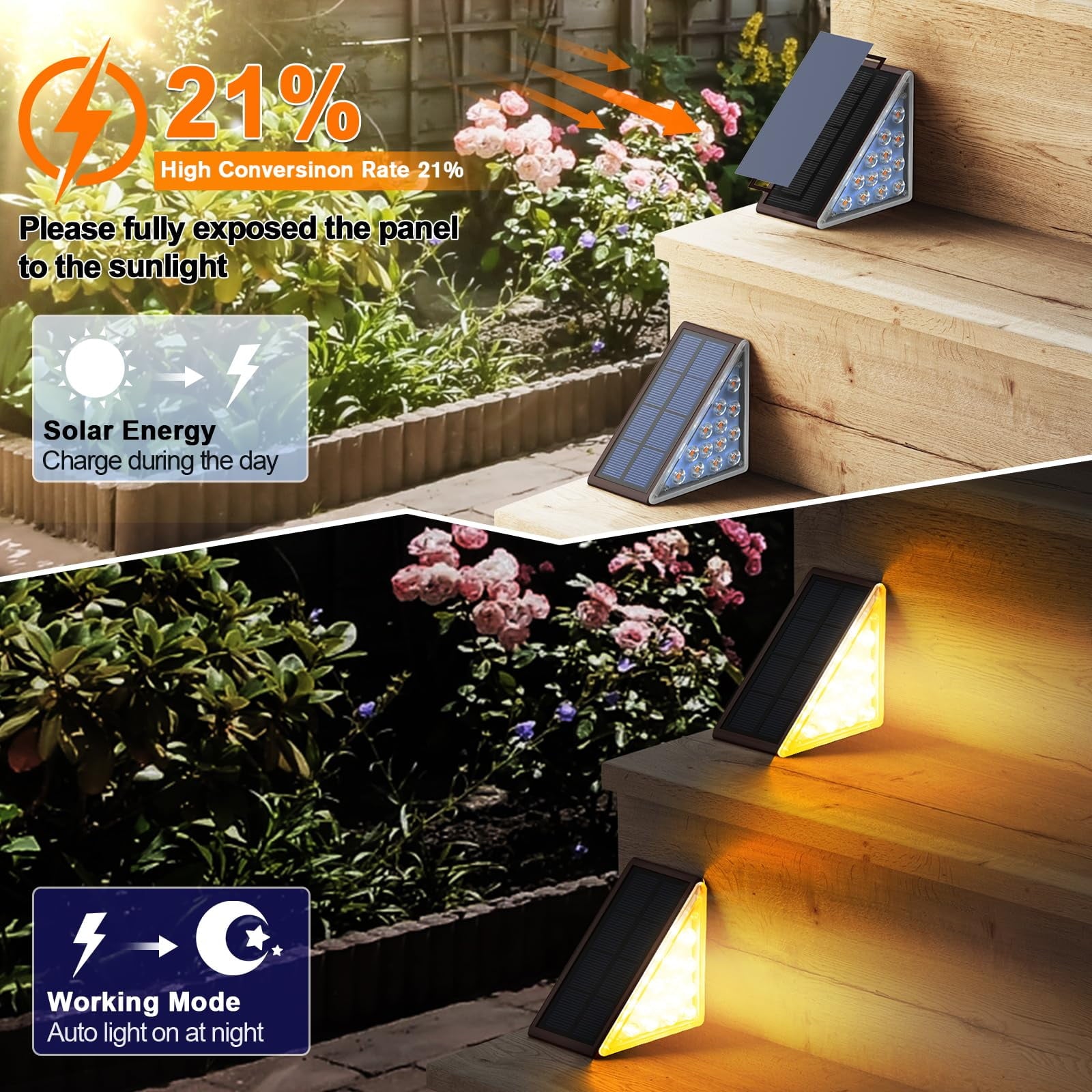 13 LEDs & Super BrightDiffer from other solar stair lights,Euur outdoor stair lights use more (13LEDs) and high-quality lamp beads,with a highly concentrated light bead lens to provide excellent and bright lighting.The larger rectangle shape of solar panel is a nod to the triangular shape of step lights, to capture as much sunlight as possible. The solar deck step lights only need 4-5 hours of charging during the day, and can achieve 8-10 hours of brightness full lighting at night.