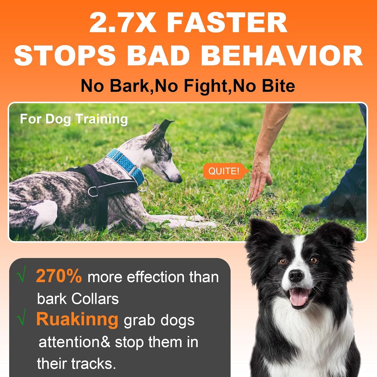 While only 10% of dogs become immune to our already advanced 25kHZ dog barking control devices we refuse to stop short of 100% effectiveness, so we added an undulating 20 to 30 kHZ 10 second ultrasonic boom. 100% painless. 100% effective. For 300% faster dog training than a dog whistle to stop barking, dog clicker for training, bark box, bark collar, air horn for dogs or in person dog training program.